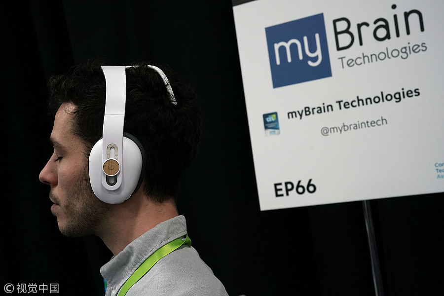 Melomind, une paire de micro-casques livrée avec quatre capteurs électro-encéphalographiques permettant de suivre l'activité du cerveau humain, présentée lors d'un événement de presse au CES de Las Vegas, le 7 janvier 2018. (Photo / VCG)