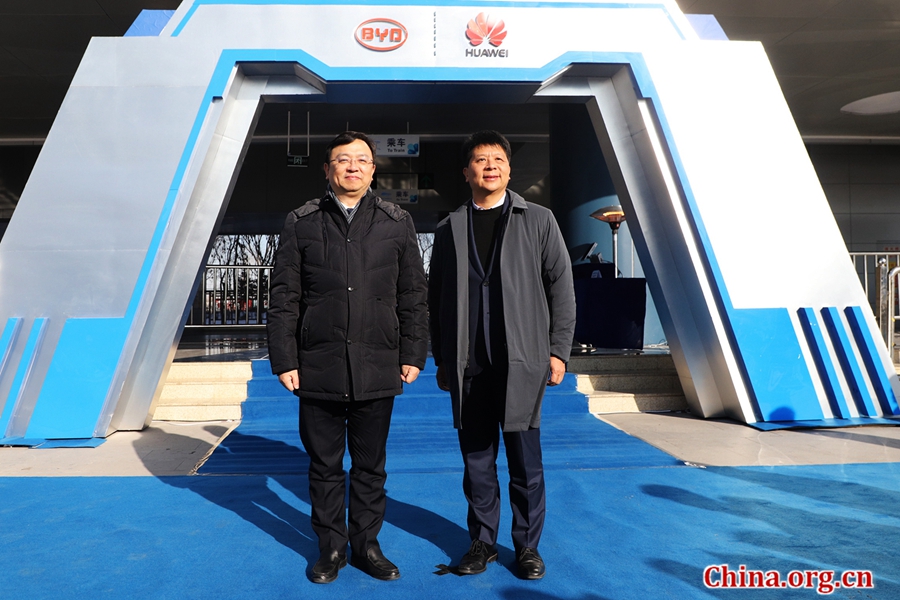 Wang Chuanfu (à gauche), président et président du conseil du constructeur automobile chinois BYD, pose pour une photo avec Guo Ping, vice-président et PDG par roulement du géant de l'électronique Huawei, lors de la présentation par les deux entreprises d'un système de monorail sans conducteur SkyRail à Yinchuan, capitale de la région autonome Hui du Ningxia (nord-ouest de la Chine), le 10 janvier 2018.