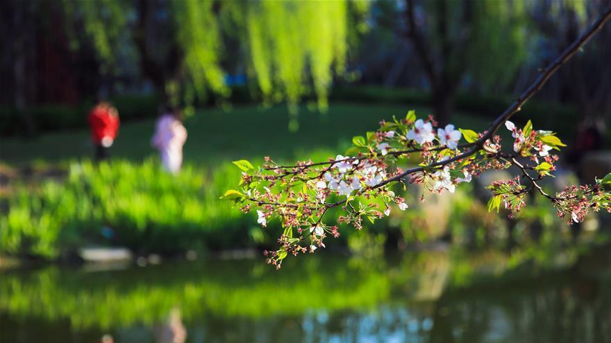 Photo prise le 28 mars au parc des fleurs de cerisier, à Ningbo, dans la province chinoise du Zhejiang. Des locaux admirent les beaux paysages printaniers dans le parc.
