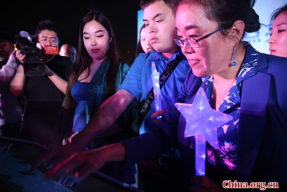 Une invitée et ses enfants touchent des cellules sur un grand écran pour éclairer des bulles à LED futuristes à l'extérieur du Cube d'eau lors de l'événement « Light It Up Blue » de 2018 à Beijing, dans la soirée du lundi 2 avril 2018, qui a marqué la 11e Journée mondiale de sensibilisation à l'autisme. L'événement, qui a eu lieu au Centre national des sports aquatiques, mieux connu sous le nom de Cube d'Eau, a appelé à plus de respect, de compréhension et d'acceptation des enfants atteints d'autisme. C'était la huitième fois depuis 2011 que ce bâtiment emblématique de la capitale chinoise accueillait cet événement d'intérêt public pour attirer davantage l'attention du public sur les besoins des enfants autistes.