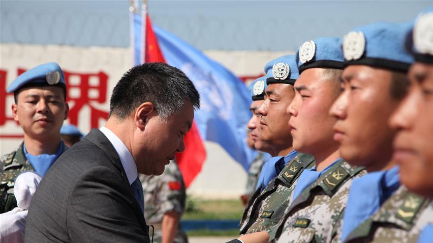Wang Kejian (devant à gauche), ambassadeur de Chine au Liban, décerne la médaille d'honneur de la paix des Nations Unies aux casques bleus chinois lors de la cérémonie de remise des décorations au détachement du génie multifonctionnel de maintien de la paix chinois au Liban, dans le village de Hanniyah (sud du Liban), le 6 avril 2018. Les 410 membres de la 16e force de maintien de la paix chinoise au Liban ont reçu la médaille d'honneur de la paix des Nations Unies vendredi, un mois avant leur transfert d'autorité au 17e contingent.