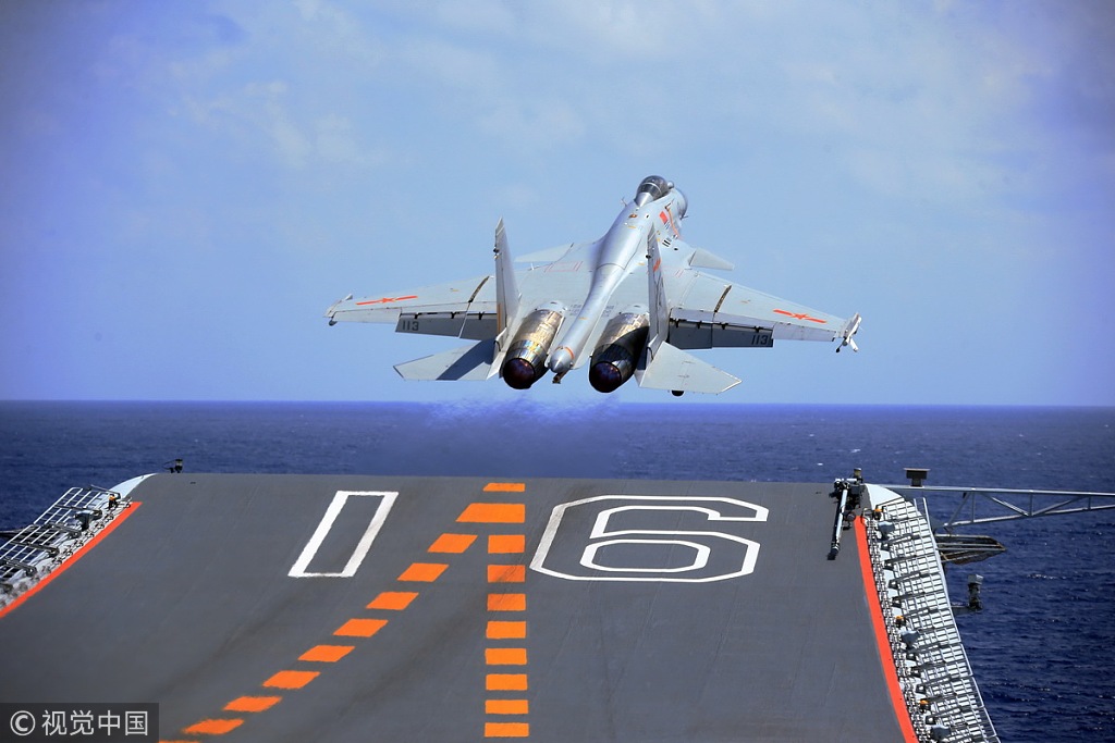 Un avion de chasse J-15 se pose sur le pont d'envol du CNS Liaoning lors d'un exercice, le 20 avril 2018. Plusieurs destroyers lance-missiles guidés, des frégates lance-missiles guidés et des douzaines d'aéronefs y ont également participé. (Hu Kaibing / Pour le China Daily)
