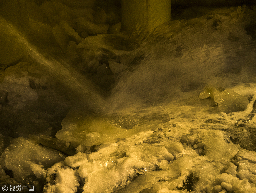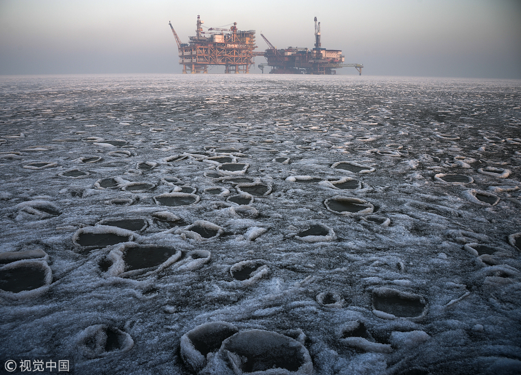 Les eaux autour de la plate-forme de forage pétrolier offshore Jinzhou 9-3 gèlent sous forme de ronds de glace par une température de -20 degrés Celsius, le 19 janvier 2018.