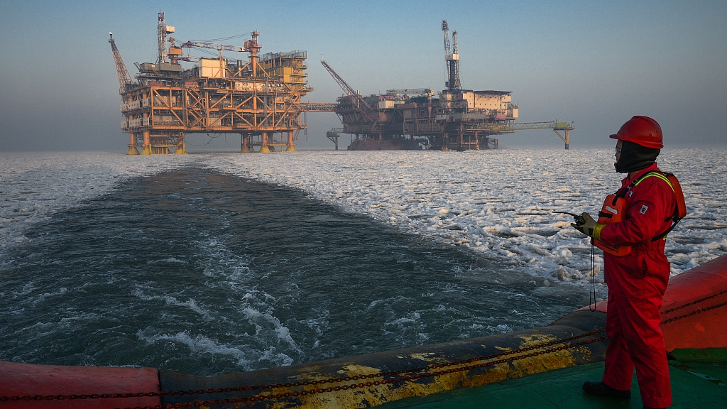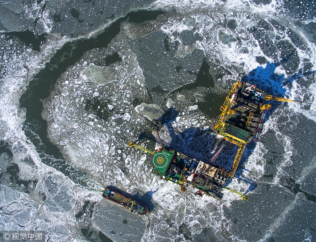 Un brise-glace laisse un sillage d'eau libre autour de la plate-forme de forage pétrolier offshore Jinzhou 9-3, le 19 janvier 2018. le brise-glace Binhai 284 compte 15 membres d'équipage, qui retournent au port pour s'y approvisionner tous les 10 jours.