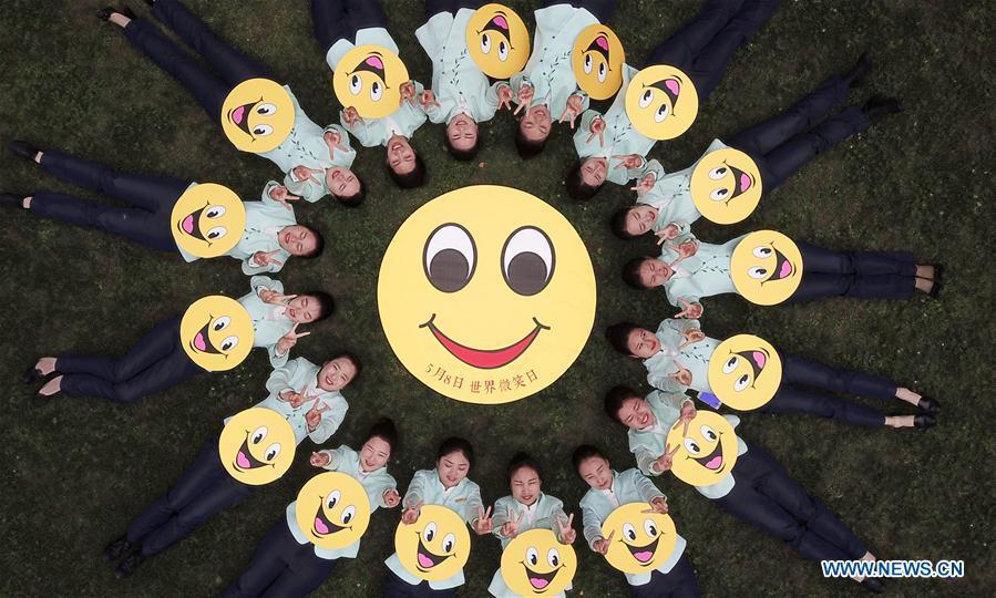 Des guides touristiques posent avec des pancartes arborant un sourire pour célébrer la Journée mondiale du sourire sur le site touristique du Lac mince de l'ouest à Yangzhou, dans la province du Jiangsu (est de la Chine), le 8 mai 2018. La Journée mondiale du sourire est célébrée le 8 mai de chaque année.