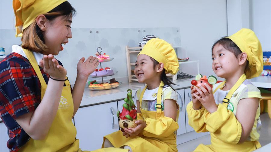 Des enfants présentent des signes souriants faits de légumes et de fruits pour célébrer la Journée mondiale du sourire à l'Ecole maternelle n°1 de Shijiazhuang, capitale de la province du Hebei (nord de la Chine), le 8 mai 2018. La Journée mondiale du sourire est célébrée le 8 mai de chaque année.