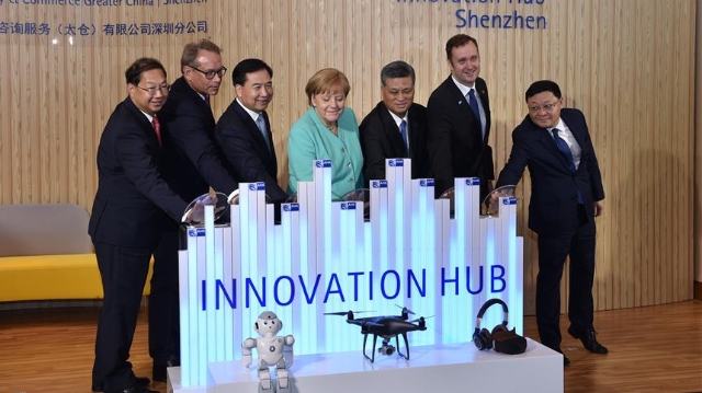 La chancelière allemande Angela Merkel (au centre) rend visite à la société Siemens (Shenzhen) Magnetic Resonance Co Ltd à Shenzhen, dans la province du Guangdong (sud de la Chine), le 25 mai 2018. (Xinhua / Mao Siqian)