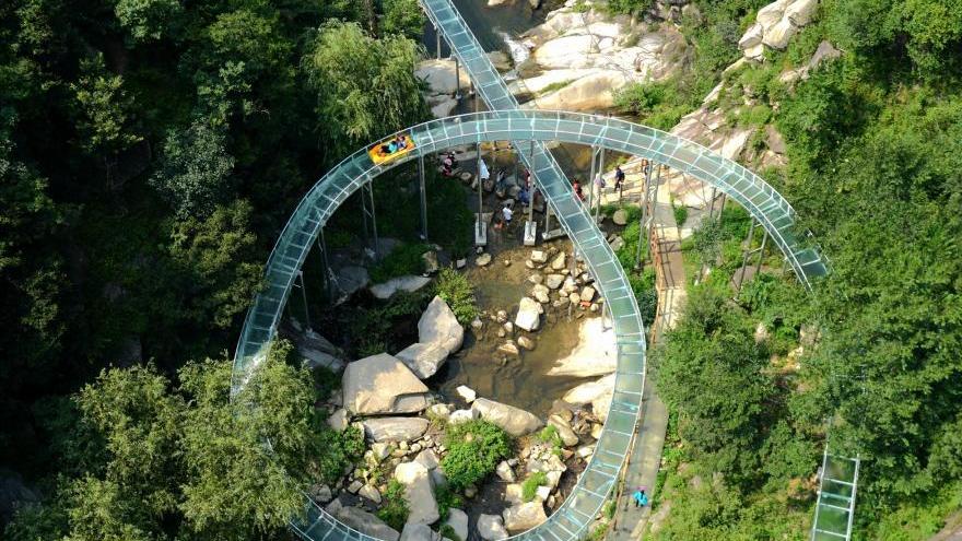 Une vue aérienne d'un toboggan installé au bord de la rivière Xiangma, dans le comté de Lushan de la province du Henan (est de la Chine), le 23 juillet 2018. Le toboggan, d'une longueur de 2,3 kilomètres et qui serpente autour d'une pente de montagne et d'une falaise, a une dénivellation de 100 mètres, ce qui lui a valu le titre de toboggan aquatique le plus long et le plus difficile du centre de la Chine. Ce site de distraction passionnant a officiellement ouvert lundi.