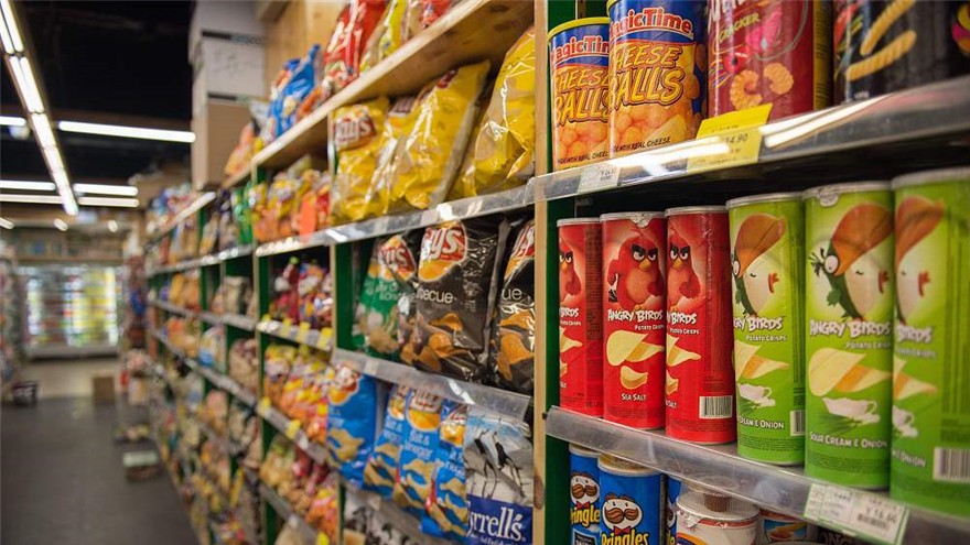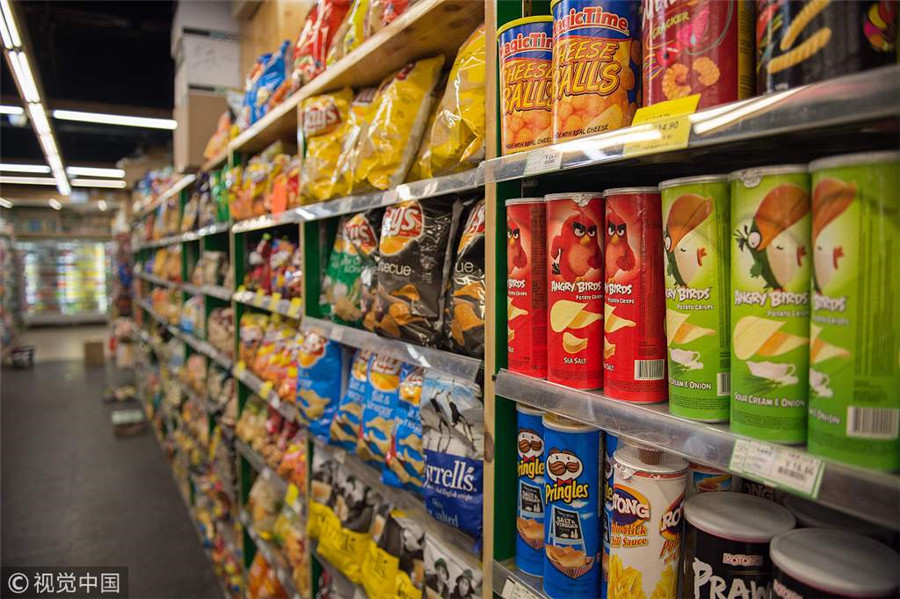 Une allée de snacks dans un supermarché de Beijing, le 21 novembre 2017. Le groupe de distribution Sun Art, dans lequel le géant chinois du commerce électronique Alibaba a investi, a enregistré un chiffre d’affaires de 54,06 milliards de yuans (7,88 milliards de dollars) au premier semestre 2018. [Photo / VCG]