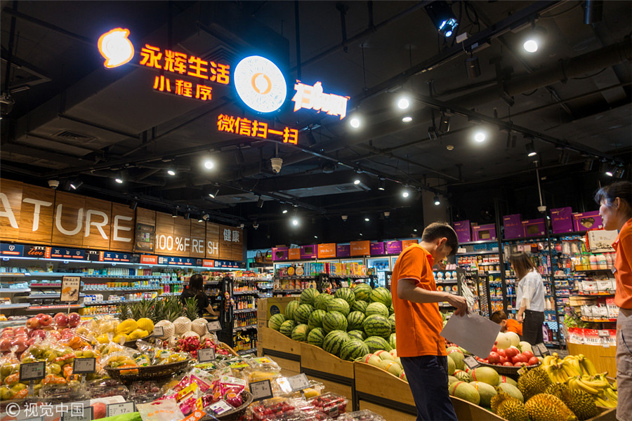 Un employé contrôle des marchandises dans un magasin Yonghui à Shanghai, le 31 mai 2018. [Photo / VCG]