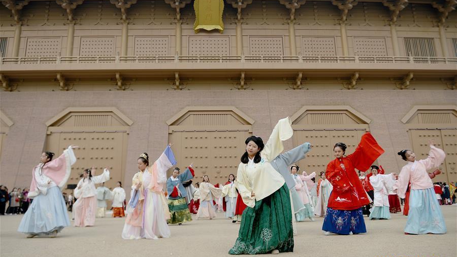 Des gens vêtus du Hanfu, le costume traditionnel chinois, se promènent lors d'une manifestation organisée dans le Parc national du patrimoine du palais Daming à Xi'an, capitale de la province du Shaanxi (nord-ouest de la Chine), le 24 novembre 2018. Plus de 400 amoureux du Hanfu ont participé à l'événement afin de promouvoir la culture chinoise traditionnelle.