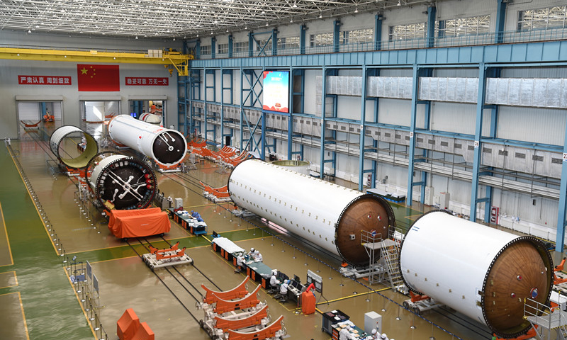 - Photo prise le 24 avril, Journée de l’espace en Chine, montrant les éléments de la fusée Longue-marche 5, dont le lancement est prévu en juillet.