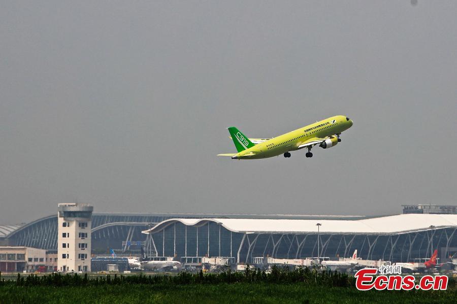 Un quatrième prototype du grand avion de transport de passagers chinois C919 décolle d'une piste de l'aéroport international de Pudong à Shanghai, le 30 août 2019, à destination de l’aéroport de Dongying, dans la province orientale du Shandong. Les essais sur ce quatrième prototype sont en cours et comprennent le système avionique, ses performances au décollage et à l'atterrissage, le système de pilotage automatique ainsi que ses performances par temps de verglas. (Photo : China News Service / Yin Liqin)