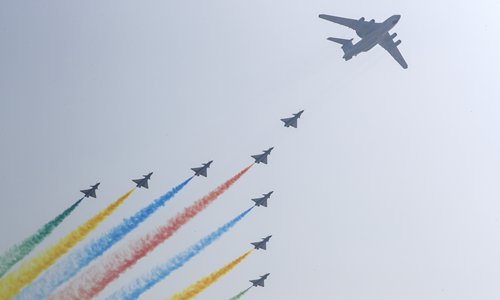 Une vidéo publiée sur le compte Sina Weibo du Quotidien du Peuple montrait un avion d'alerte précoce KJ-2000 dirigeant huit avions de combat J-10 de l'équipe d’acrobatie aérienne Bayi, qui traînaient des panaches de rouge, de bleu, de jaune et de vert.