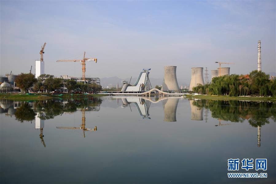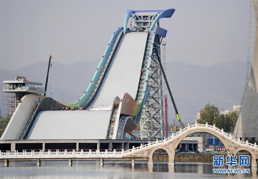Photo montrant un tremplin de saut à ski achevé après plus de 300 jours de construction, le 1er novembre 2019 à Beijing. C’est le premier site nouveau construit pour les Jeux olympiques d'hiver de 2022 et le seul pour les événements sur neige à Beijing.
