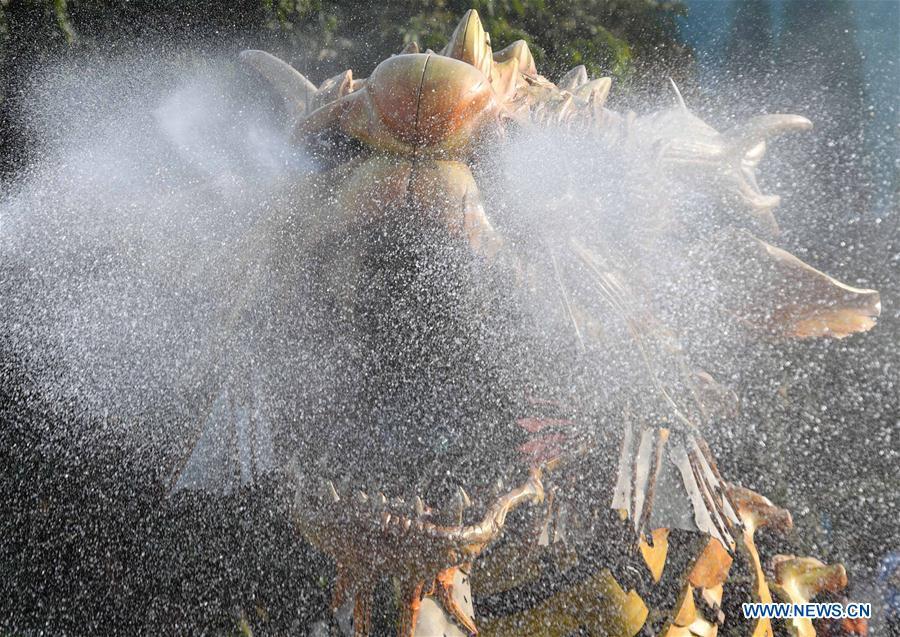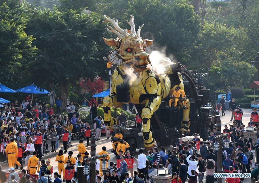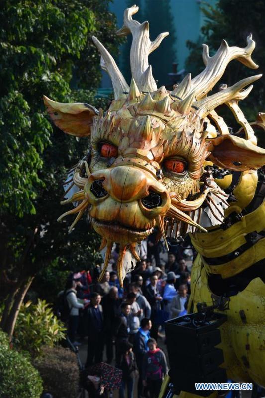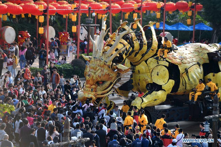 Des gens regardent le cheval-dragon mécanique Long Ma au Chimelong Ocean Kingdom à Zhuhai, dans la province du Guangdong (sud de la Chine), le 18 janvier 2020. Long Ma a été fabriqué en 2014 par la société de production française La Machine pour célébrer le 50e anniversaire de l’établissement des relations diplomatiques entre la France et Chine. Opérée conjointement par 15 personnes, la créature mécanique géante peut effectuer de nombreuses actions, notamment secouer la tête, courir, plier les pattes, cligner des yeux, cracher du feu et souffler des nuages de brouillard.