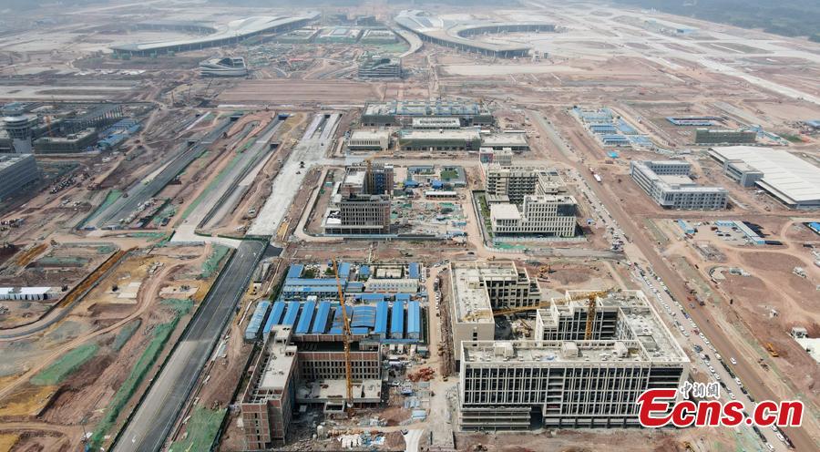 Photo prise le 4 juin 2020, montrant une vue aérienne de l'aéroport international de Chengdu Tianfu en construction à Chengdu, la capitale de la province du Sichuan (sud-ouest de la Chine). L'aéroport devrait être mis en service en juillet 2021. (Liu Zhongjun / China News Service)