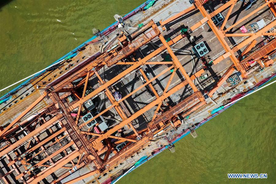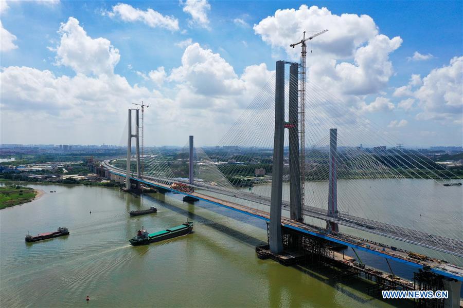 Photo aérienne prise le 9 août 2020, montrant le site d'installation de la dernière poutre-caisson en acier d'un grand pont ferroviaire à haubans sur la rivière Xijiang, dans la province chinoise du Guangdong (sud). Ce grand pont à haubans, une section du chemin de fer du port de Nansha, a terminé l’installation de sa dernière poutre-caisson en acier dimanche. (Xinhua / Liu Dawei)