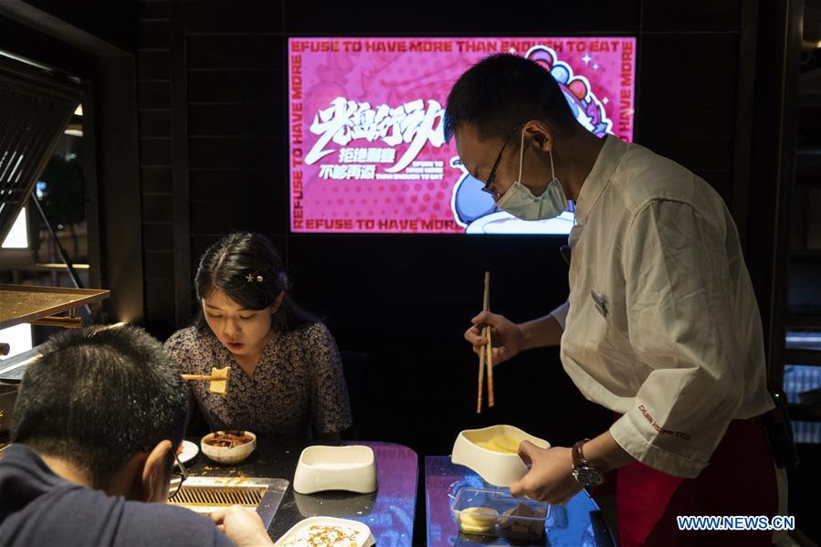 Un membre du personnel emballe des restes de plats chauds pour les clients dans un restaurant de fondue chinoise de Chengdu, capitale de la province du Sichuan (sud-ouest de la Chine), le 7 septembre 2020.
