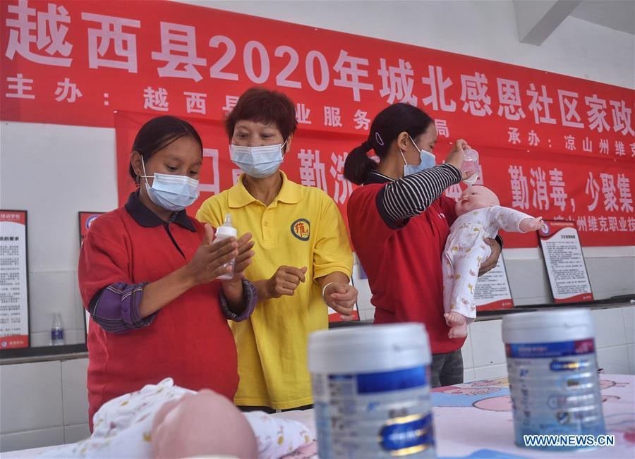 Des femmes participent à une formation sur les services ménagers dans une communauté du comté de Yuexi de la préfecture autonome Yi de Liangshan, dans la province du Sichuan (sud-ouest de la Chine) le 11 septembre 2020.