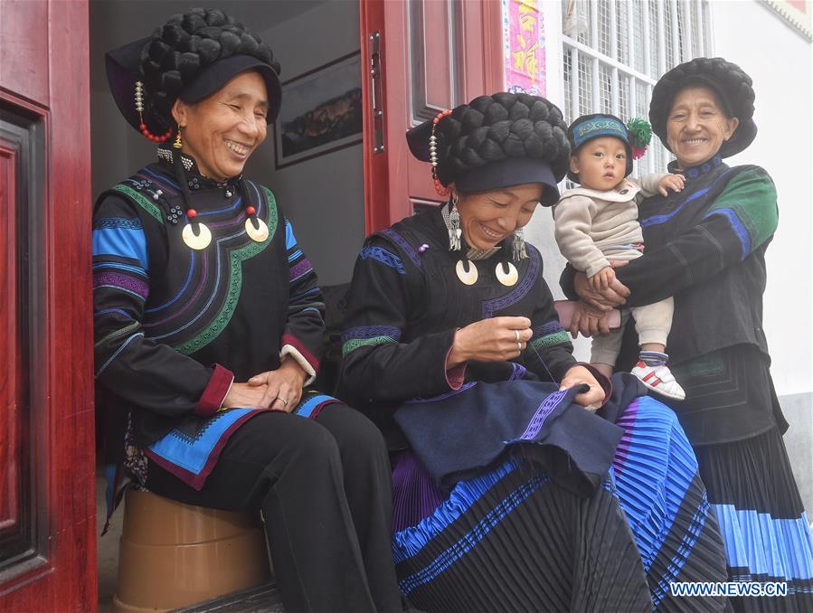 Ayi (2e à gauche) brode tout en discutant avec des voisins du village de Xujiashan, dans le comté de Ganluo de la préfecture autonome Yi de Liangshan, dans la province du Sichuan (sud-ouest de la Chine), le 10 septembre 2020.