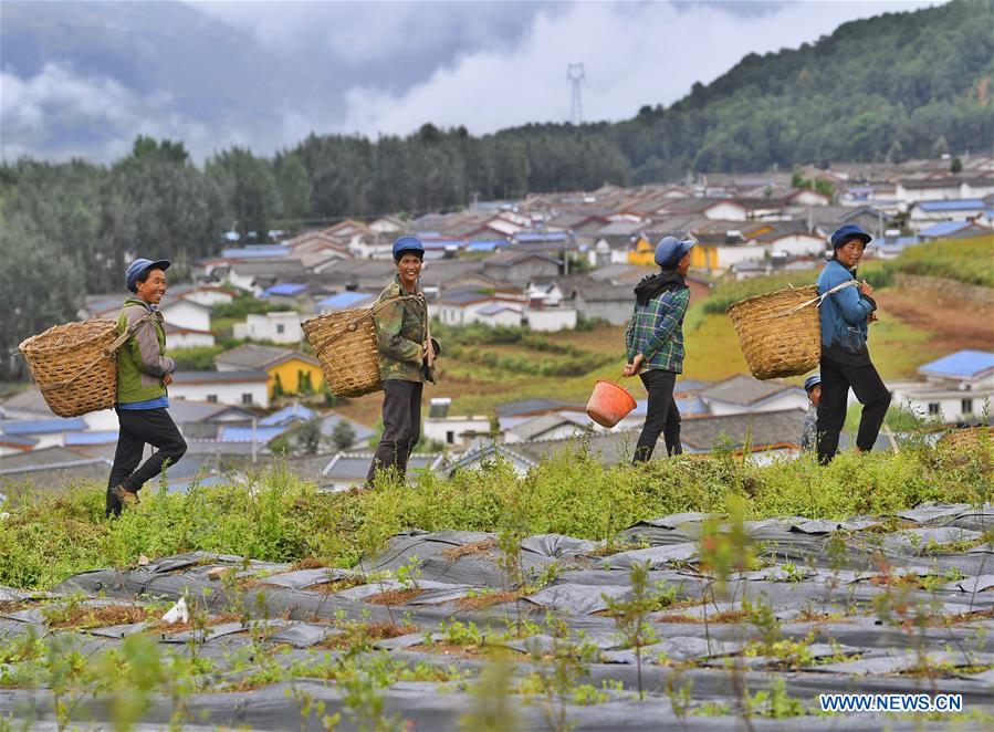 Des femmes marchent vers une base de plantation de myrtilles pour y travailler dans le village de Laoji du comté de Butuo, dans la préfecture autonome Yi de Liangshan de la province du Sichuan (sud-ouest de la Chine), le 13 août 2020.