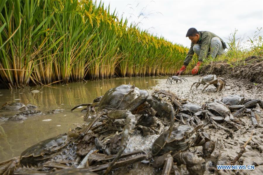 Un villageois ramasse des crabes dans les rizières du village de Lingtou, dans la zone de développement économique de Lutai de la ville de Tangshan, dans la province du Hebei (nord de la Chine). Ces dernières années, les autorités locales de Lutai ont déployé des efforts dans la production de riz biologique. Les gens ici ont développé un mode d'éco-agriculture commensal riz-crabe dans lequel les crabes de rivière sont élevés dans les rizières. Ce mode a créé une nouvelle méthode pour les agriculteurs qui plantent du riz pour augmenter leurs revenus. (Mu Yu / Xinhua)