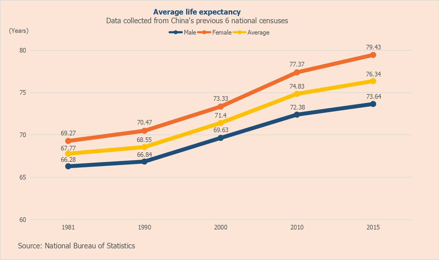 L'amélioration des conditions de vie, d'alimentation et d'hygiène qui a suivi le développement économique de la Chine a fait passer l'espérance de vie d'une moyenne de 67,77 ans en 1982 à 74,83 ans en 2010. Les données du Bureau national des statistiques ont montré que l'espérance de vie moyenne en 2015 atteignait 76,34 ans.