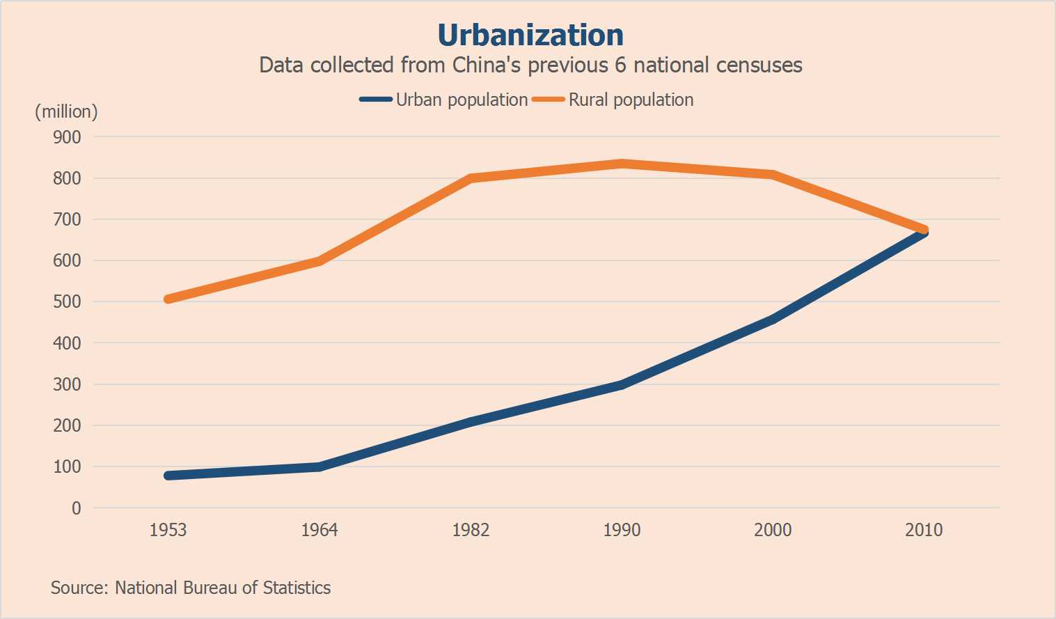 Enfin la réforme et l'ouverture de la Chine ont progressivement créé le plus grand flux de migration interne de l'histoire du monde. Suite à l'industrialisation du pays, un nombre croissant de personnes ont commencé à vivre dans les villes, ce qui a conduit le taux d'urbanisation à augmenter rapidement au cours des dernières décennies.