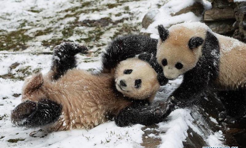 - Des pandas géants jouent après la neige dans la base de Shenshuping du Centre chinois de conservation et de recherche sur le panda géant, située dans la réserve naturelle nationale de Wolong, dans la province du Sichuan (sud-ouest de la Chine), le 17 décembre 2020.