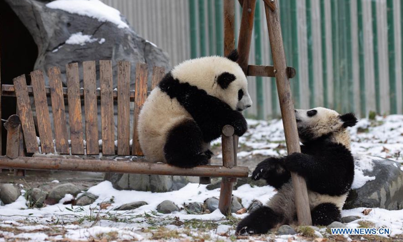 - Des pandas géants jouent après la neige dans la base de Shenshuping du Centre chinois de conservation et de recherche sur le panda géant, située dans la réserve naturelle nationale de Wolong, dans la province du Sichuan (sud-ouest de la Chine), le 17 décembre 2020.