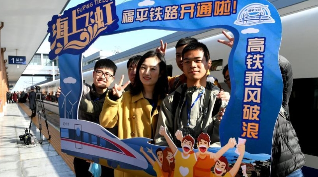 La ligne de chemin de fer reliant Fuzhou et Pingtan, toutes les deux dans la province du Fujian, a été mise en service le 26 décembre. Le viaduc route-rail du détroit de Pingtan a également été ouvert à la circulation à cette occasion. Le trajet entre les deux villes est ainsi réduit à 35 minutes. (Photo : Wang Dongming / ChinaNews)