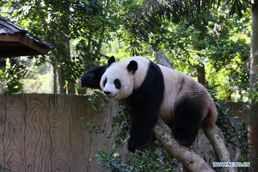 - Le panda géant Gong Gong grimpe à un arbre au Parc animalier tropical et jardin botanique de Hainan à Haikou, capitale de la province de Hainan (sud de la Chine), le 12 janvier 2021.