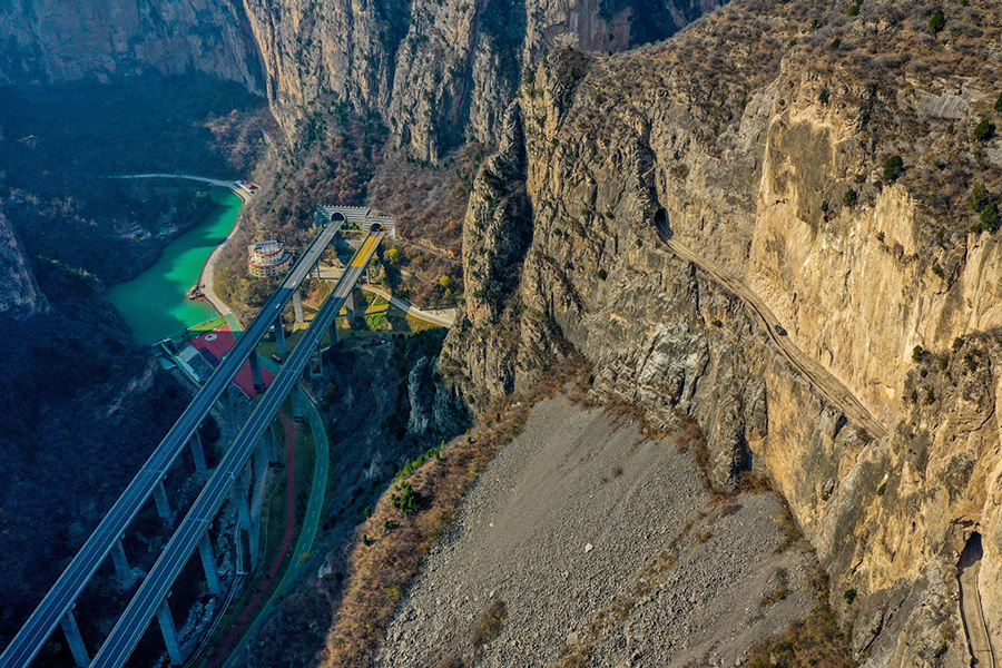 Photo aérienne impressionnante prise le 12 novembre 2020 montrant une autoroute (à gauche) et une autoroute (à droite) longeant le flanc d'une falaise dans la province du Shanxi (nord de la Chine).