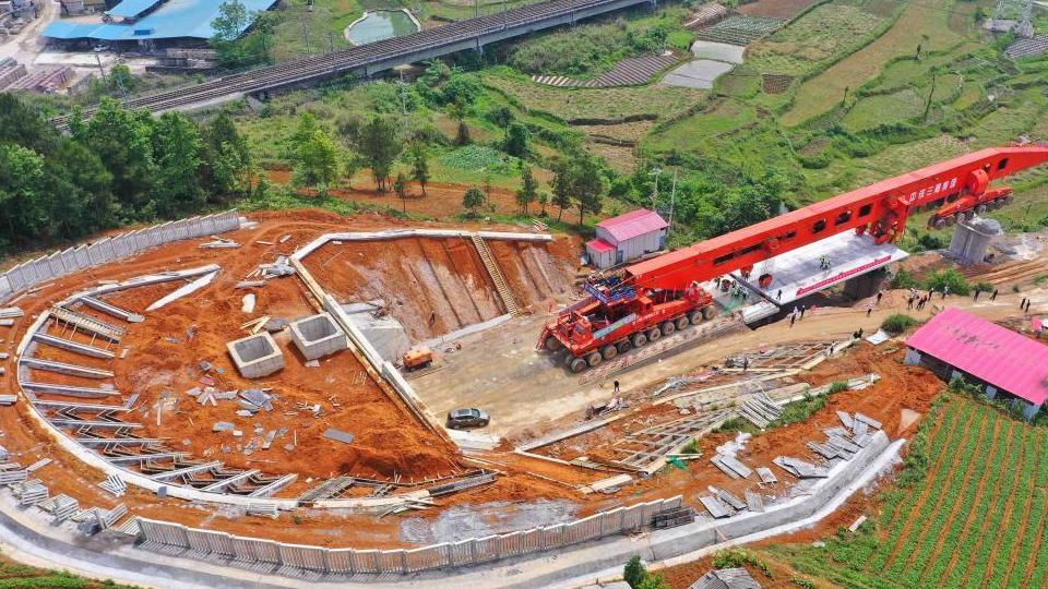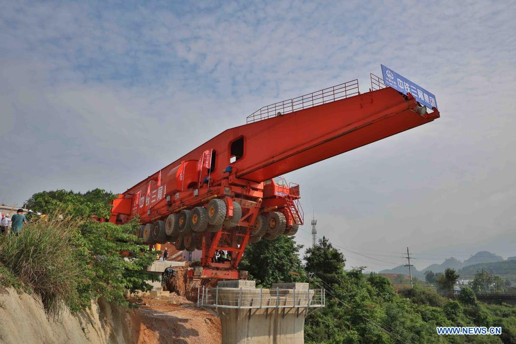 Une machine de montage de poutres déplace la première poutre-caisson du super grand pont de Yingpan Qingshuihe, dans la ville de Duyun, dans la province du Guizhou (sud-ouest de la Chine), le 8 mai 2021. Les ouvrier ont commencé le 8 mai à ériger des poutres pour l’ouvrage, long de 1 820 mètres. La pose de la première poutre caisson de 500 tonnes a été sécurisée avec succès au sommet des piles.