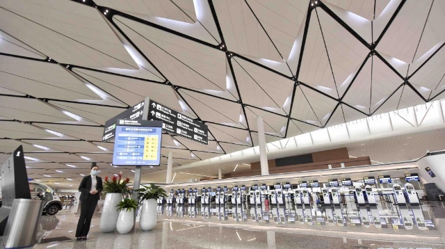 Photo prise le 23 juin, montrant le hall de correspondance du centre de transport de l'aéroport international Tianfu de Chengdu, dans la province du Sichuan (sud-ouest). Situé à environ 50 kilomètres du centre-ville de Chengdu, l'aéroport sera officiellement mis en service le dimanche 27 juin, ce qui fera de Chengdu la troisième ville chinoise possédant deux aéroports internationaux après Shanghai et Beijing. (Photos : Liu Kun/Xinhua)