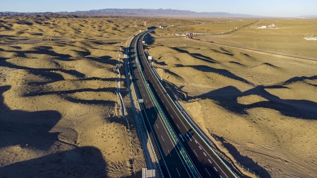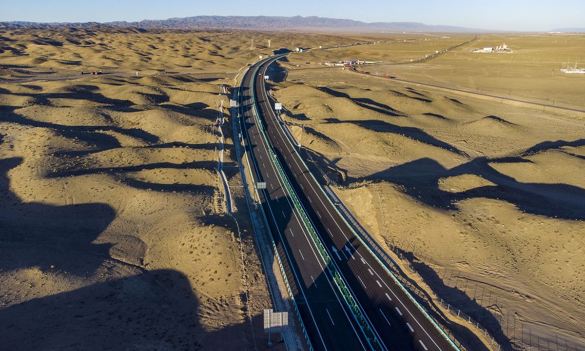 L'autoroute, qui relie la capitale du pays Beijing et Urumqi, la capitale régionale du Xinjiang, a une longueur totale de 2 800 km, dont plus de 500 km traversant le désert et un no man's land.