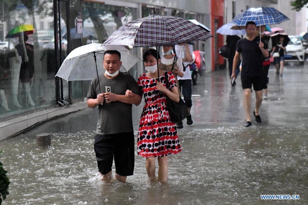 Des gens marchent sur une route inondée à Zhengzhou, chef-lieu de la province chinoise du Henan (centre), le 20 juillet 2021. Depuis le 16 juillet, plus de 144 660 habitants ont été affectés par des pluies torrentielles au Henan, et 10 152 ont été déplacés en lieux sûrs, a déclaré mardi le Siège provincial de lutte contre les inondations et de secours en cas de sécheresse. Au total, 16 réservoirs de grande et moyenne taille ont vu leurs niveaux d'eau dépasser le niveau d'alerte après que des pluies torrentielles se sont abattues sur la plupart des régions de la province lundi et mardi. (Xinhua/Zhu Xiang)