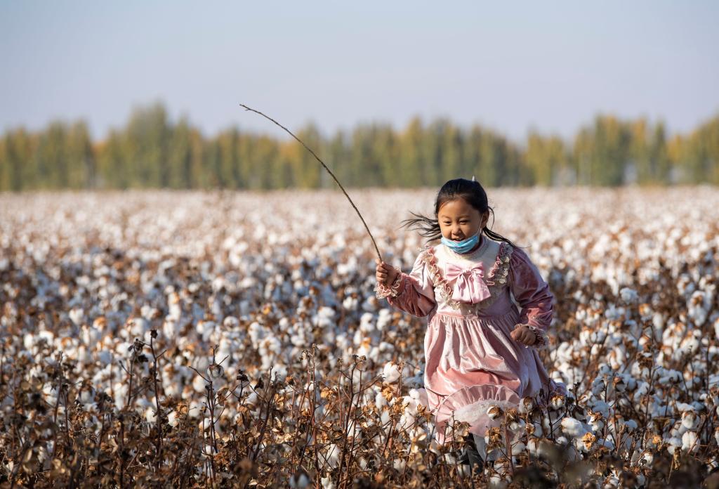 Photo montrant la petite-fille de Lu Gaolin en train de courir dans un champ de coton dans la ville de Shawan, dans la région autonome ouïghoure du Xinjiang (nord-ouest de la Chine), le 24 octobre 2021.