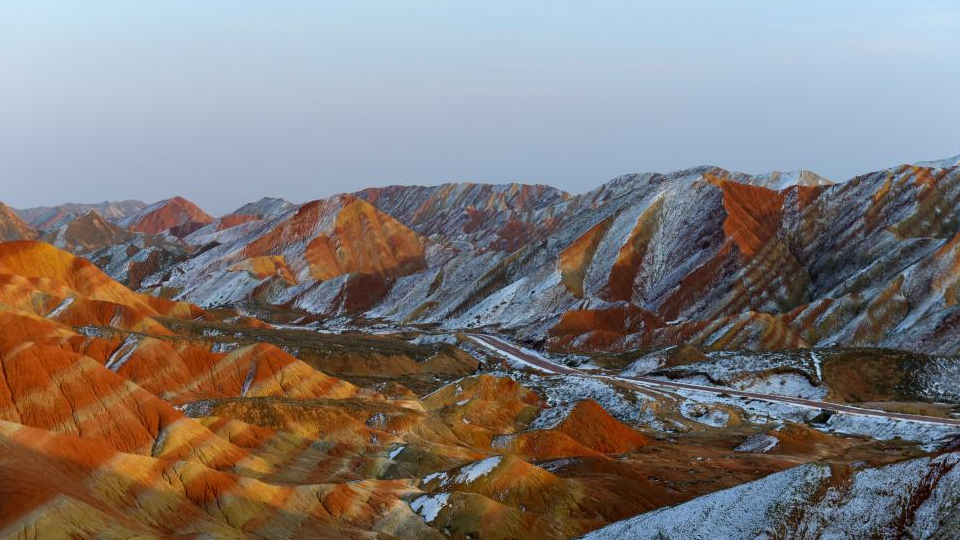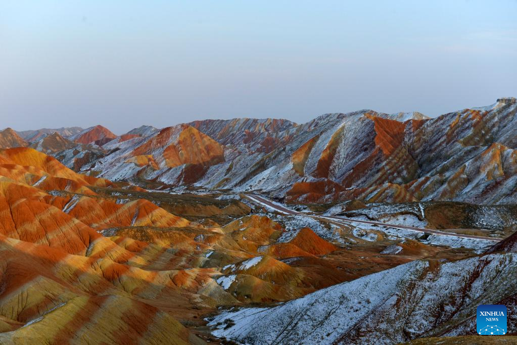 Photo prise le 8 février 2022 montrant un paysage enneigé de reliefs Danxia, caractérisés par des éléments de grès rougeâtre, dans le parc géologique national des Danxia de Zhangye, dans la province du Gansu (nord-ouest de la Chine). (Zheng Yaode / Xinhua)