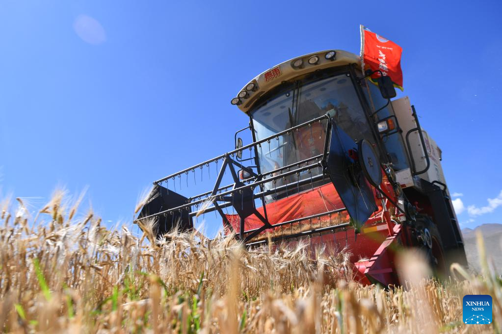 Une moissonneuse au travail dans le champ d'orge des hautes terres du canton de Rasog, dans le comté de Gyangze de la ville de Xigaze, dans la région autonome du Tibet (sud-ouest de la Chine), le 19 septembre 2022. (Jigme Dorje / Xinhua)