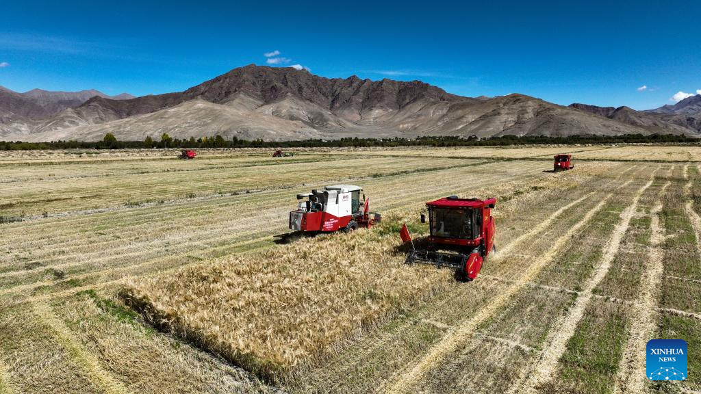 Une moissonneuse au travail dans le champ d'orge des hautes terres du canton de Rasog, dans le comté de Gyangze de la ville de Xigaze, dans la région autonome du Tibet (sud-ouest de la Chine), le 19 septembre 2022.