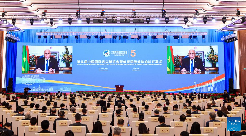 Mohamed Ould Ghazouani, président de la Mauritanie, s’exprime par vidéo lors de la cérémonie d’ouverture de la 5e CIIE, le 4 novembre à Shanghai (est de la Chine). (Fang Zhe / Xinhua)