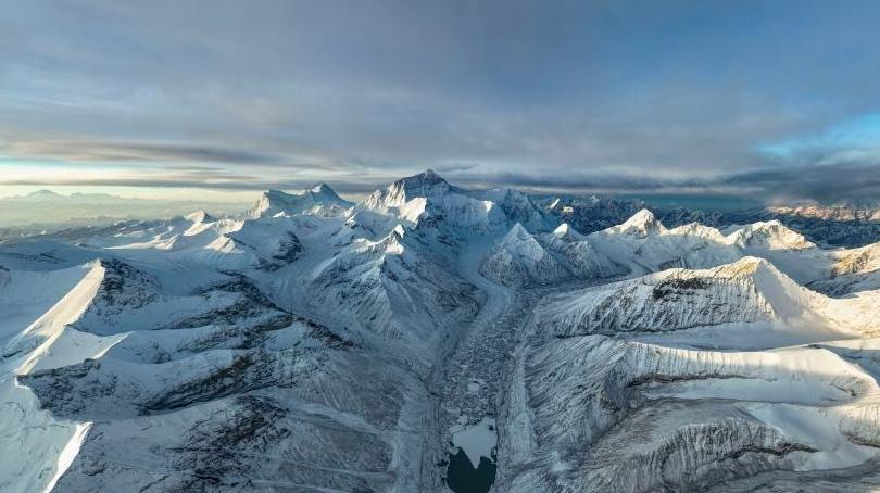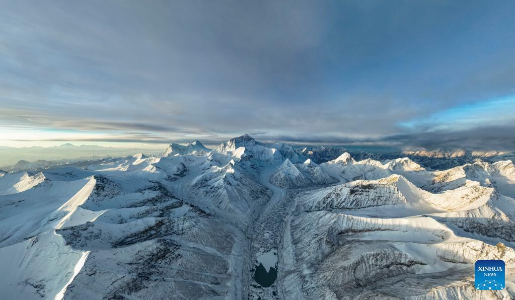 Photo aérienne prise le 23 mai 2023 montrant une vue du mont Qomolangma, plus connu sous le nom de mont Everest, et des montagnes de l'Himalaya à une altitude de 8 400 mètres, dans la région autonome du Tibet (sud-ouest de la Chine). (Sun Fei / Xinhua)