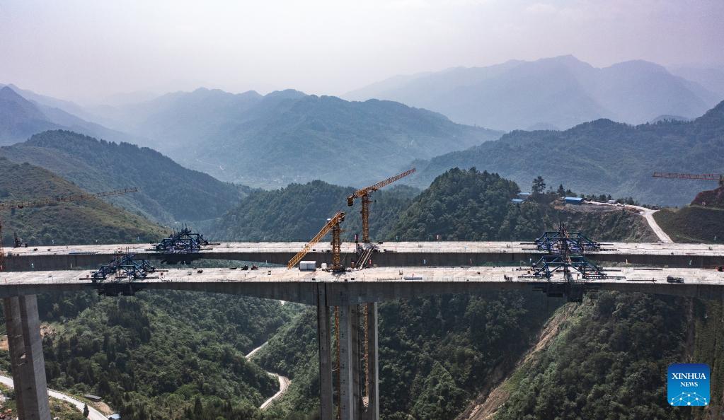Photo aérienne prise le 27 mai 2023 montrant le chantier de construction du grand pont de Qingchi, situé dans le district de Jinsha de la ville de Bijie, dans la province du Guizhou (sud-ouest de la Chine). Le pont, dont les travaux de construction se poursuivent sans heurts, est un projet clé le long de l'autoroute Guiyang-Jinsha-Gulin. (Tao Liang / Xinhua)