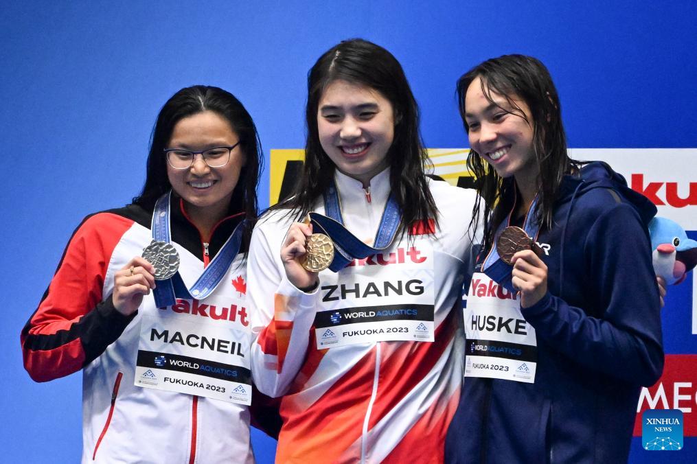 Zhang Yufei a remporté le titre du 100 m papillon féminin et Qin Haiyang a enregistré une victoire historique en brasse le 24 juillet à Fukuoka, au Japon, alors que la Chine consolidait son avance au classement des médailles aux Championnats du monde aquatiques. Dans le même temps, Yu Yiting, 17 ans, a ajouté une médaille de bronze lors du 200 m quatre nages individuel féminin à la riche récolte de médailles de la Chine lors de la deuxième journée de la compétition de natation.
