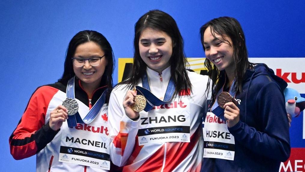 Quelques minutes plus tard seulement, Zhang Yufei, médaillée d'or du 200 m papillon aux Jeux olympiques de Tokyo, a offert à la Chine sa deuxième médaille d'or en natation aux championnats du monde de Fukuoka lors du 100 m papillon féminin avec un temps de 56,12 secondes. La Canadienne Margaret MacNeil a terminé deuxième en 56,45 secondes et la championne en titre, l’Américaine Torri Huske, a terminé troisième avec un temps de 56,61 secondes.