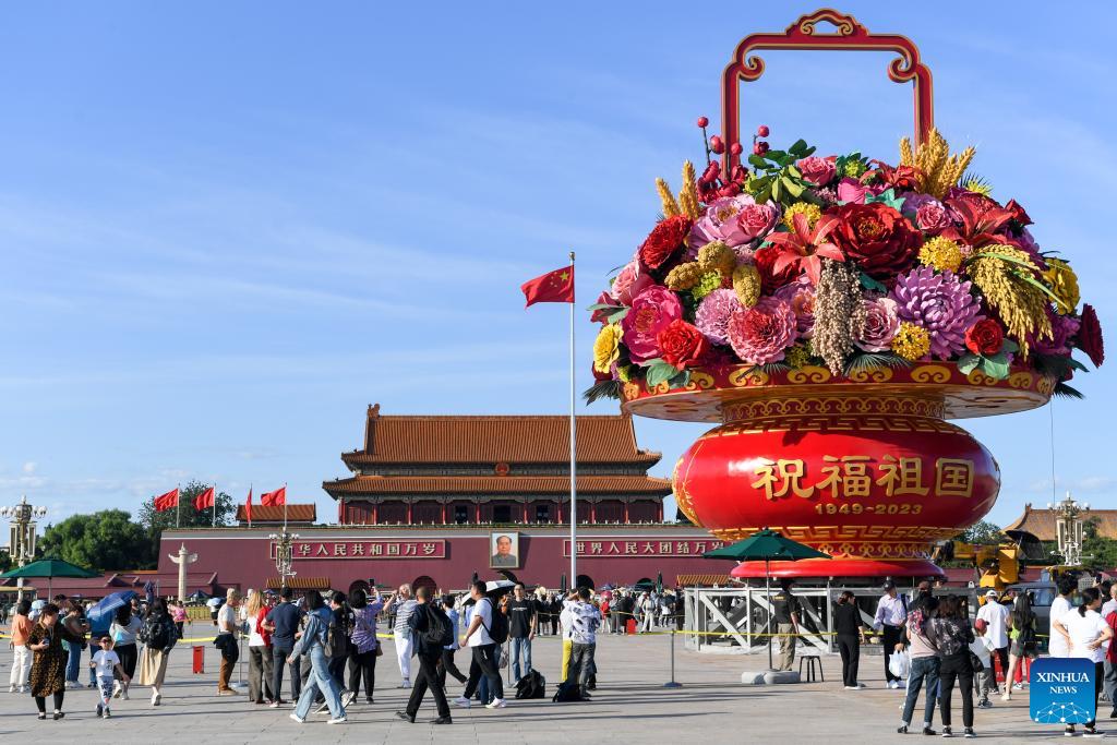 Photo prise le 22 septembre 2023 du « panier de fleurs » installé sur la place Tian'anmen de Beijing, la capitale chinoise. L'installation de 18 mètres de haut orne la célèbre place à l'occasion des congés de la fête nationale à venir (Xinhua/Ju Huanzong).