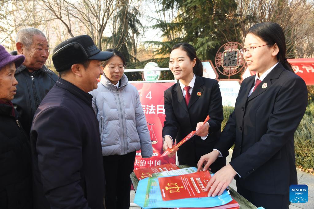 Des membres du personnel du parquet populaire local présentent la Constitution dans un parc de Xinle, à Shijiazhuang, capitale de la province du Hebei (nord de la Chine), le 4 décembre 2023. La Chine a célébré lundi sa 10e Journée nationale de la Constitution. (Jia Minjie / Xinhua)