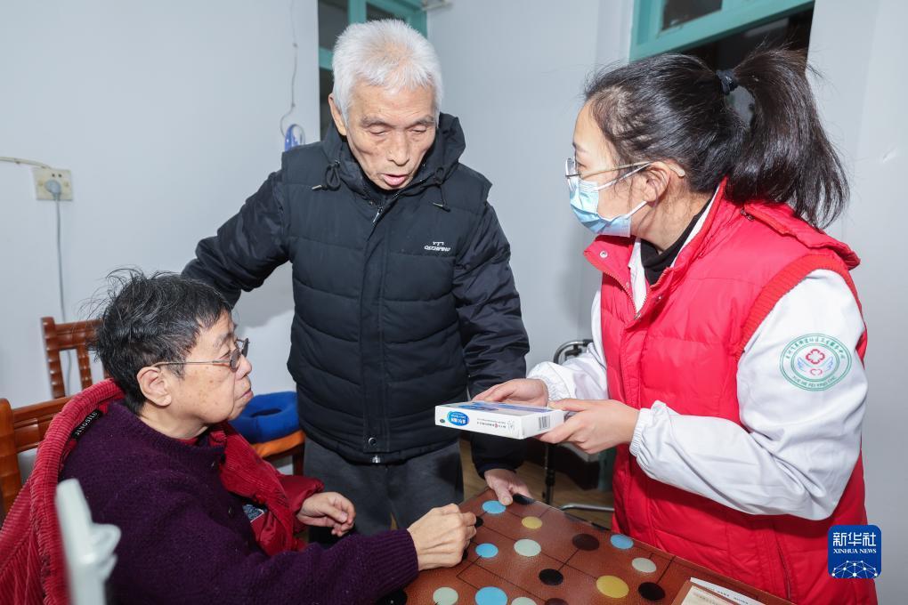 Photo prise le 13 décembre, montrant une bénévole en train d’offrir une consultation médicale gratuite chez une habitante au quartier de Feiying, à Huzhou, dans la province du Zhejiang (est). Le centre des services sanitaires Yuehe de ce quartier a mis en place diverses mesures, dont notamment le prolongement des horaires d’ouverture du centre et la vulgarisation des connaissances médicales parmi les habitants, afin de mieux faire face aux maladies respiratoires, qui connaissent généralement leur pic de diffusion en hiver.